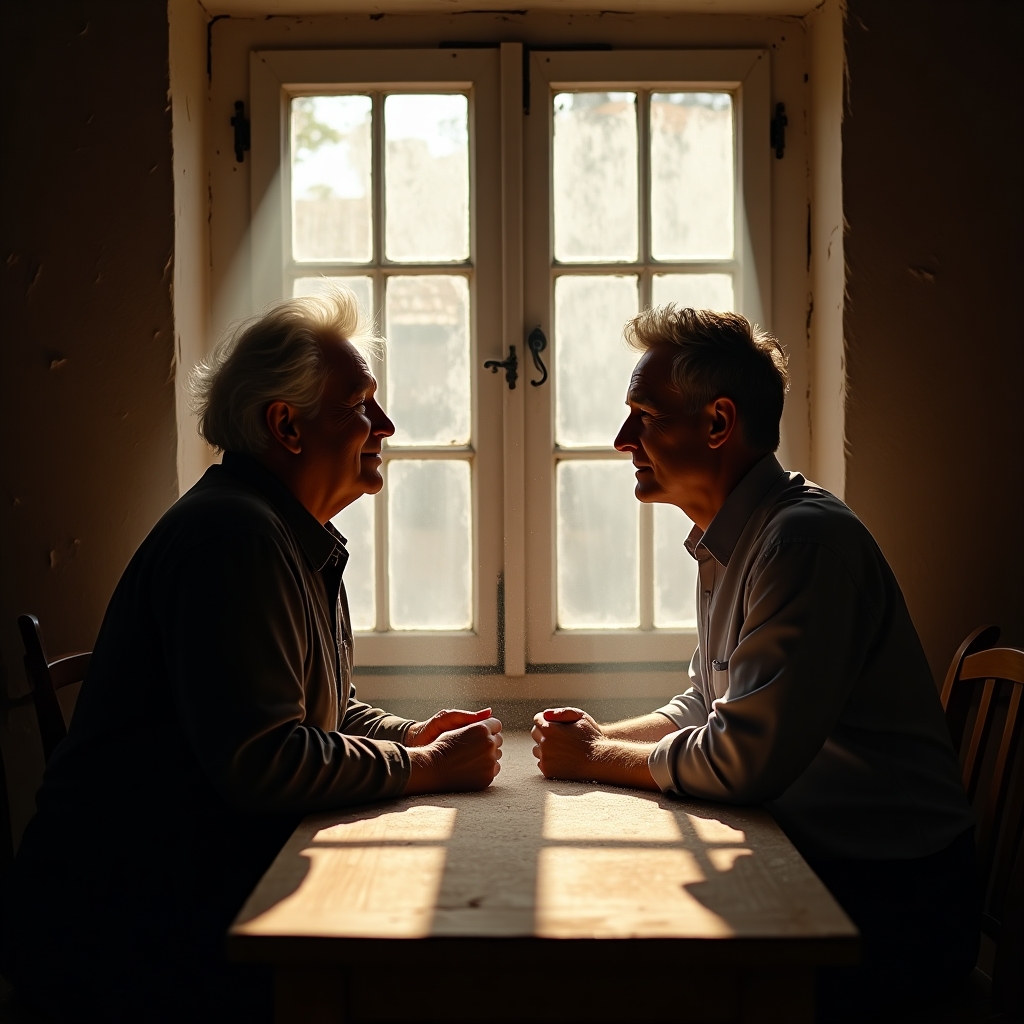 They sat, the wooden chairs creaking softly. Mary noticed his hands, still strong and capable, though marked by the passage of time. Her own hands rested on the table, fingers tracing the grain of the wood, grounding her in the present.