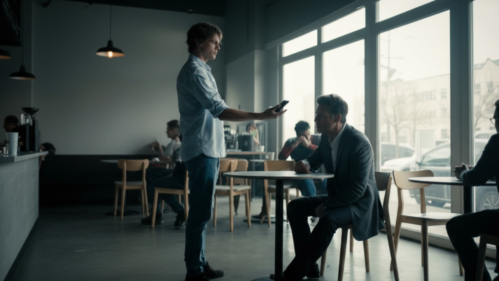 “Excuse me,” the businessman says, walking over to the crying man. His voice carries across the café. “Are you alright?”
