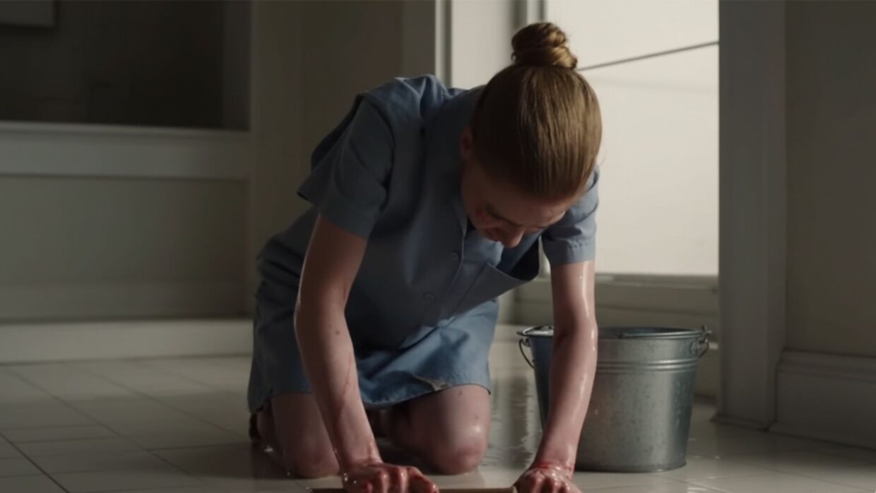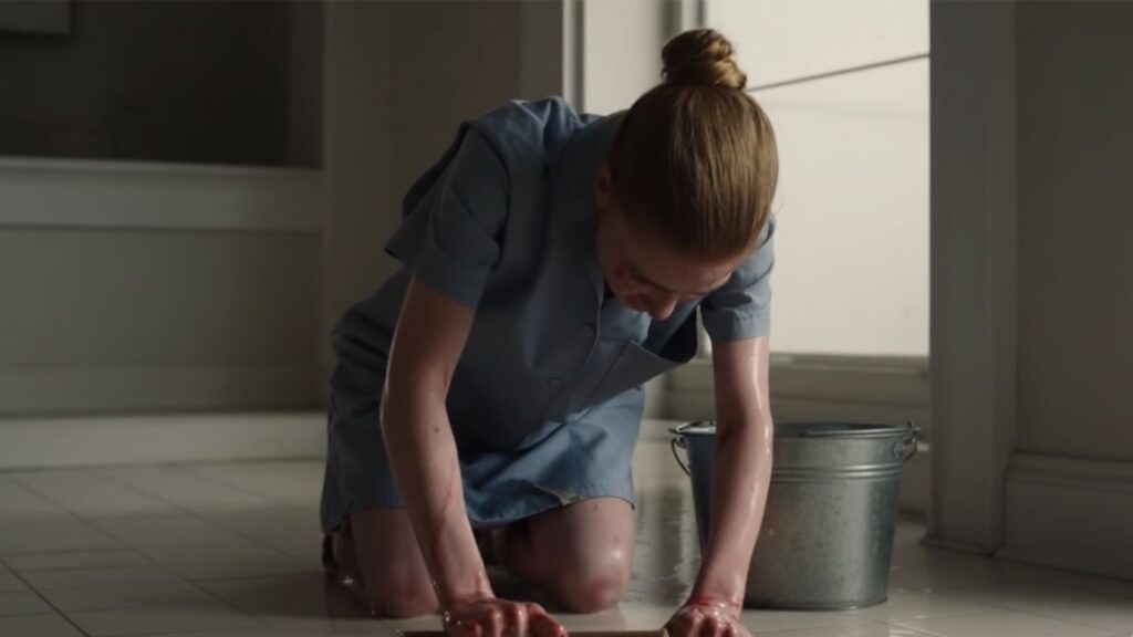 Someone was on their knees near the base of the staircase, scrubbing the floor with a hand brush. A woman. She wore a faded gray uniform, the kind you’d see on housekeeping staff at a budget motel. Her hair was pulled back tight. Her shoulders were narrow, almost skeletal.