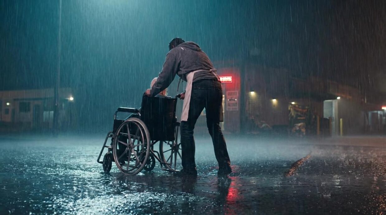 The wheels stuck on the broken sidewalk. Emma used every ounce of strength to push through the rain. Her arms burned. Her back screamed. But she kept going.
