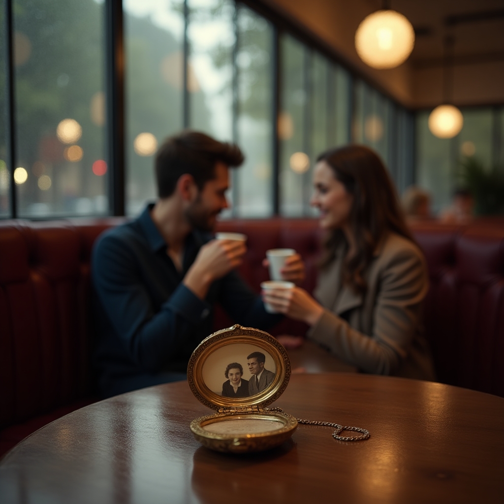 After a while, Tom excused himself to get another round of coffee, leaving Emma to reflect on the serendipity of their meeting. Her eyes wandered to a small locket he had left on the table, its cover etched with intricate patterns. Curious, she picked it up and opened it.