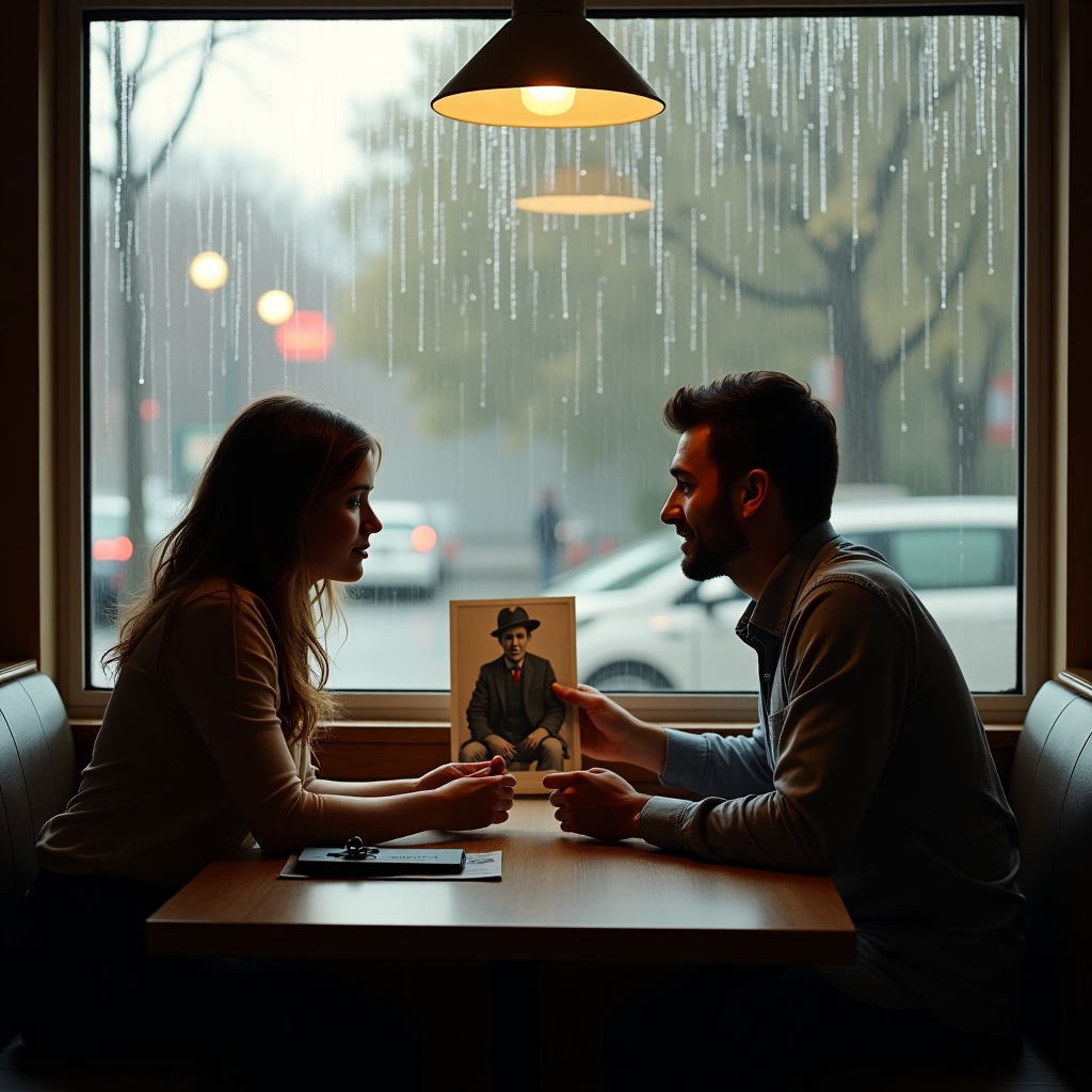 He led her to a small diner around the corner, its neon lights casting a soft glow in the mist. They sat in a booth by the window, steam from their coffees mingling in the air.